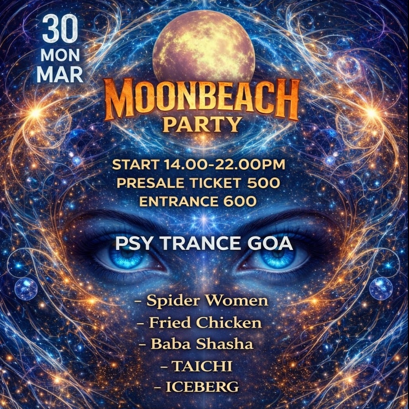 Event Date: Saturday, March 28, 2026 at 2:00 PM Step into the cosmic flow 🌕✨ MOONBEACH PARTY is calling…   🔥 DJ Lineup: Spider Women Fried Chicken Baba Shasha TAICHI ICEBERG   Psy Trance • Goa • River vibes Dance under the full moon and lose yourself in the sound.…