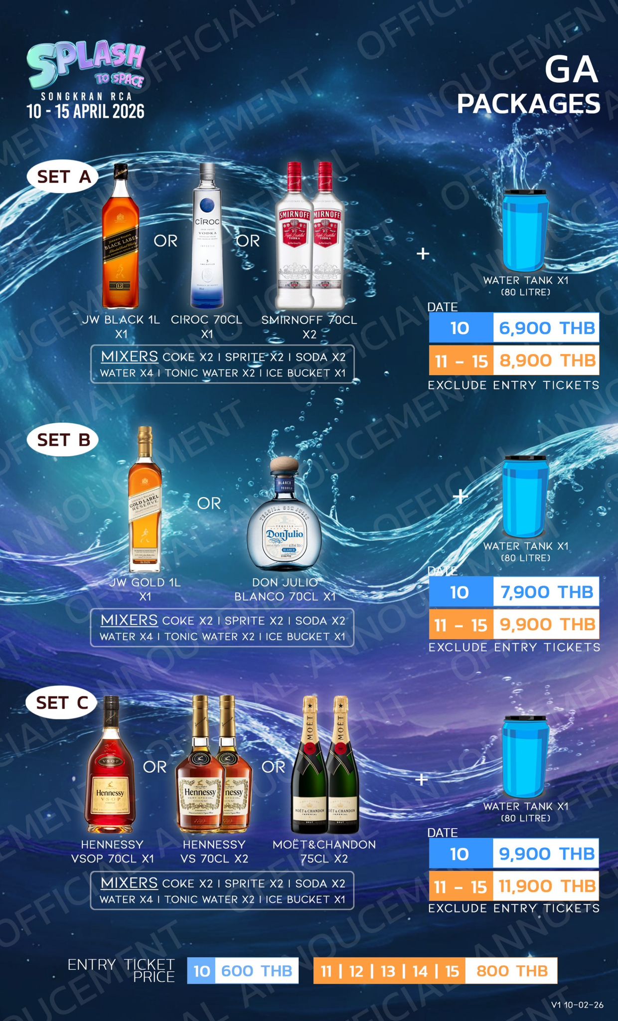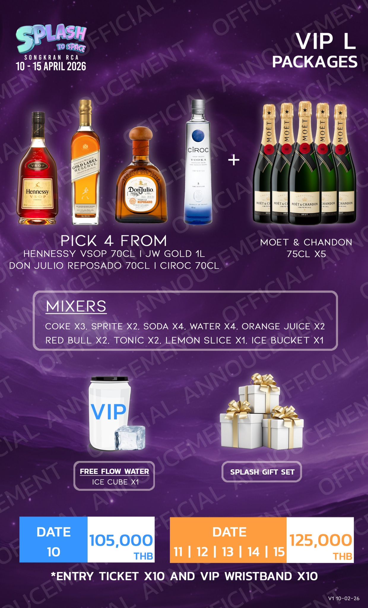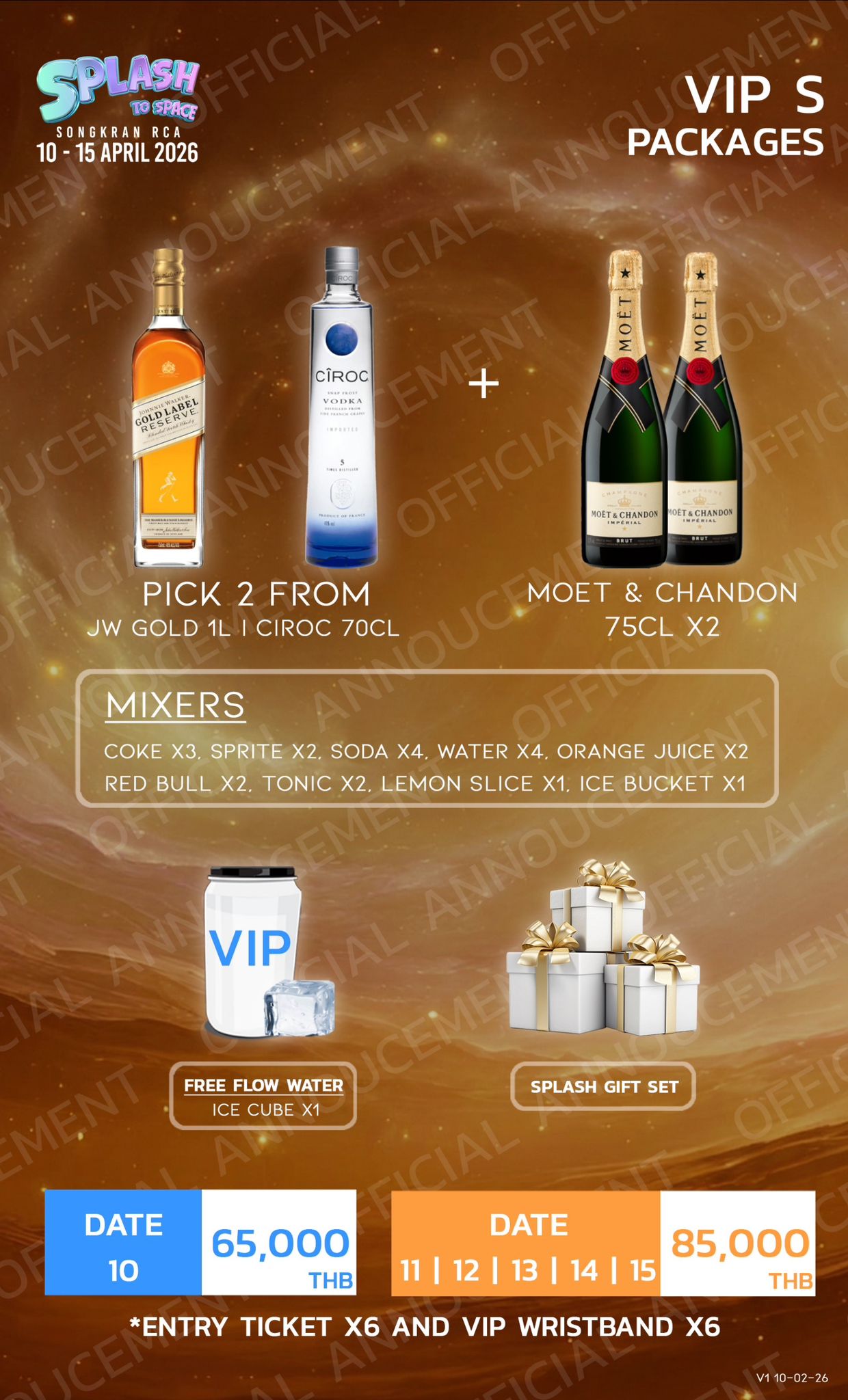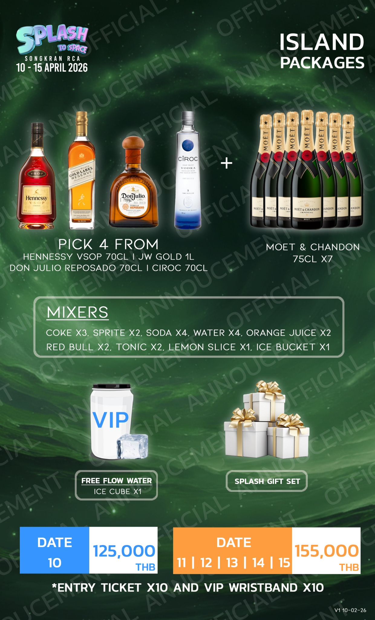 VIP tickets are 1600 THB on the 10th and 1800 THB on the 18th per PAX.
