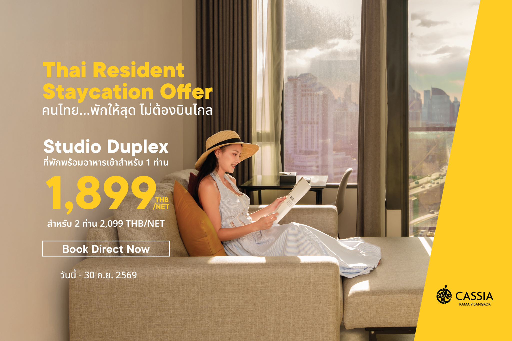 Event Date: Friday, April 17, 2026 at 12:00 AM ✨ Thai Resident Staycation Offer @ Cassia Rama 9 Bangkok คนไทย…พักให้สุด ไม่ต้องบินไกล เปลี่ยนวันธรรมดาให้เป็นวันพักผ่อนสุดชิล ใจกลางพระราม 9 กับห้องพักสไตล์ Duplex สุดเก๋ พร้อมวิวเมืองสุดปัง และสิ่งอำนวยความสะดวกครบครัน 🏨 Studio Duplex พร้อมอาหารเช้าสำหรับ 1 ท่าน 💛 เพียง 1,899 บาทสุทธิ / คืน 👫 พัก 2 ท่าน เพียง 2,099 บาทสุทธิ ✨ สิทธิประโยชน์เพิ่มเติม…